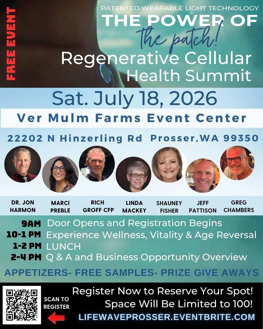 Discover LifeWave Washington Saturday, July 18, 2026 9:00 AM 4:00 PM Ver Mulm Farm Event Center 22202 North Hinzerling Road Prosser, WA 99350 Prosser, WA 99350 United States (map) Google Calendar ICS Register Now